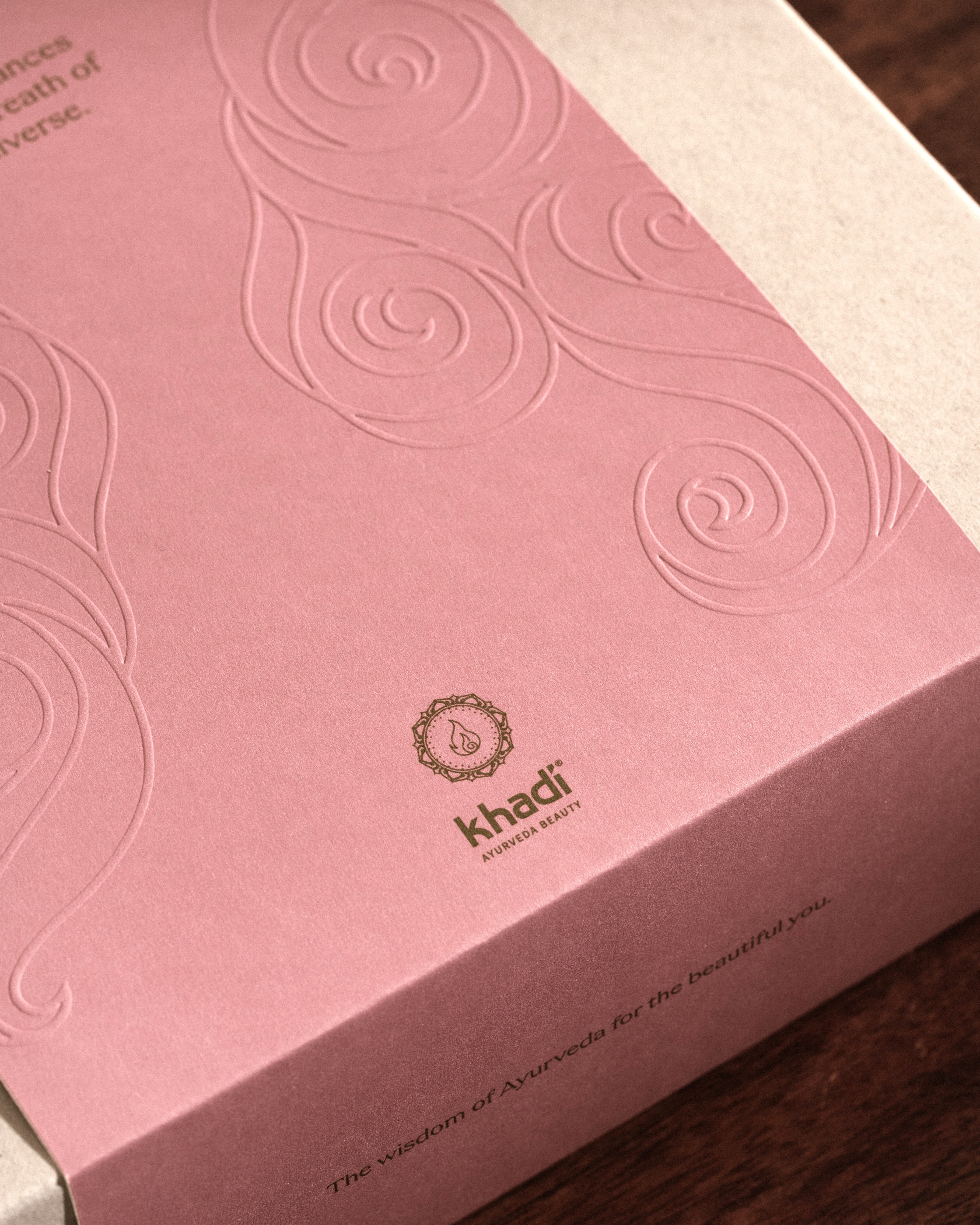 Chaque coffret khadi est soigneusement présenté dans une boîte cadeau de haute qualité en carton de reliure, sublimée par un gaufrage artistique réalisé par l’artiste milanais Nikita Fabbro. Chaque coffret est un rituel. Chaque rituel, un cadeau.