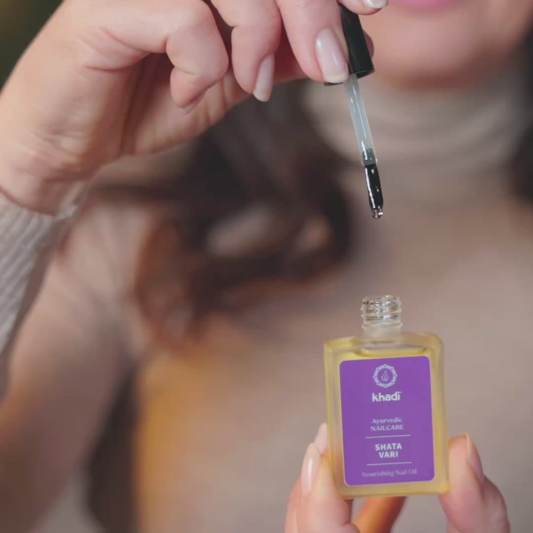 Soin Ayurvédique pour des ongles forts, élastiques et des cuticules délicatement nourries : le khadi Shatavari Nourishing Nail Oil réunit la force d’huiles végétales précieuses, pressées à froid, et d’un Élixir de Plantes Médicinales Ayurvédique issu de 7 plantes et racines, dont Shatavari, Ashwagandha, Amla et Mauve Indienne.